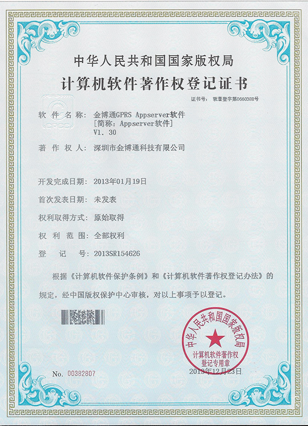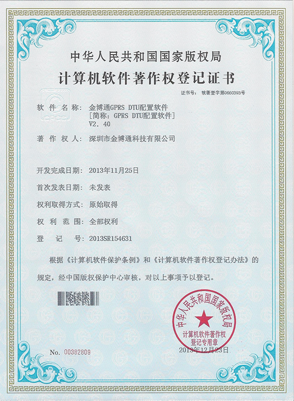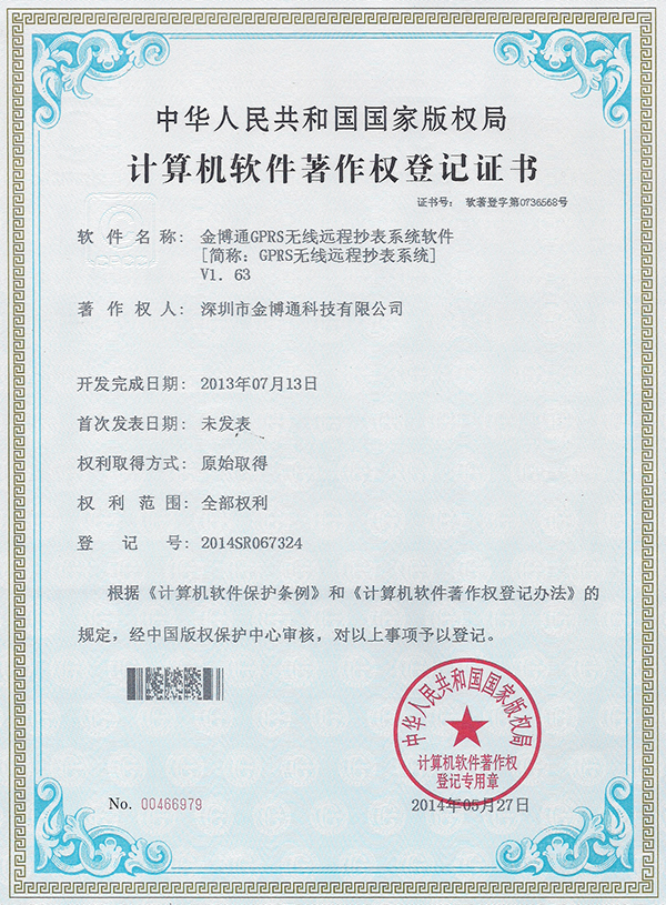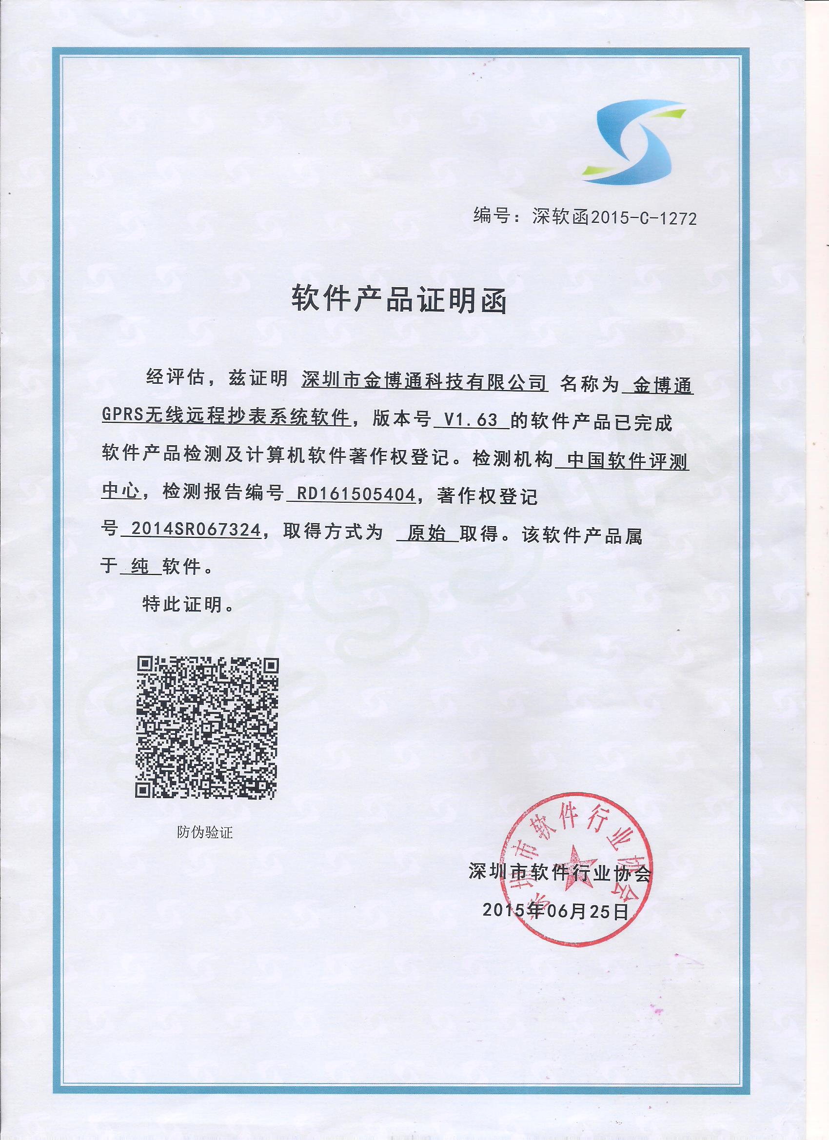 GPRS抄表軟件(jiàn)V1.63證書(shū)