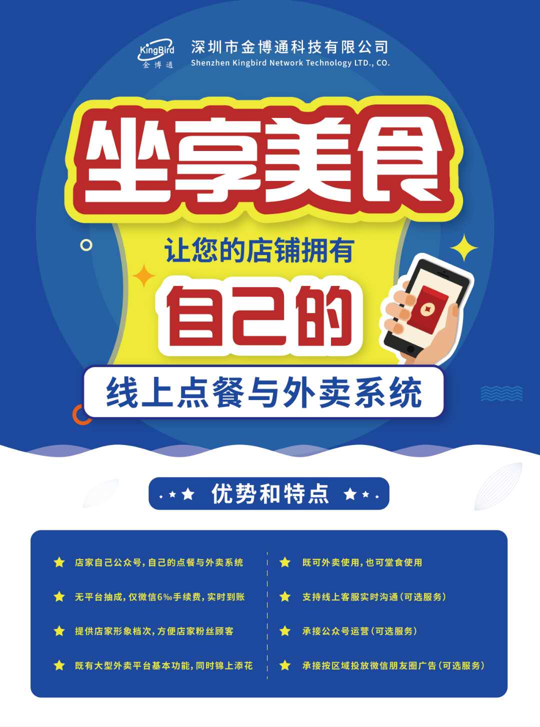 為(wèi)什(shén)麽建議(yì)你(nǐ)找金(jīn)博通(tōng)呢(ne)?金(jīn)博通(tōng)創建的(de)線上(sh←àng)點餐與外(wài)賣系統,擁有(yǒu)著(zhe)獨一(yī)無二的(de)優勢。利用(yòng)店(diàn)家(jiā)自(zì)己的(de)公衆号,幫助店(d←iàn)家(jiā)建立自(zì)己的(de)點餐與外(wài)賣系統,且該系統既有(yǒu)大(dà)型外(wài)賣平台的(de↔)基本功能(néng),還(hái)能(néng)錦上(shàng)添花(huā)。它不(bù)僅可(kě)以外(wài)賣使用(yòng),也(yě)可(kě)以堂食使用(yòng),還(hái)支持線上(shàng)客服實時(shí)溝通(tōng)。重要(yào)的(de)是(shì),店(diàn)家(ji×ā)擁有(yǒu)自(zì)己的(de)線上(shàng)點餐與外(wài)賣系統之後,免去(qù)了(le)平台抽成,隻有(yǒ u)微(wēi)信6‰手續費(fèi),實時(shí)到(dào)賬。此外(wài),為(wèi)了(le)方便店(diàn)家(jiā)留住粉絲和(hé)吸引顧'客,金(jīn)博通(tōng)還(hái)提供店(diàn)家(jiā)形象檔次服務以及承接公衆号運營、按區(qū)域投放(fàng)微(wēi)信朋(péng)友(yǒu)圈廣告。₽